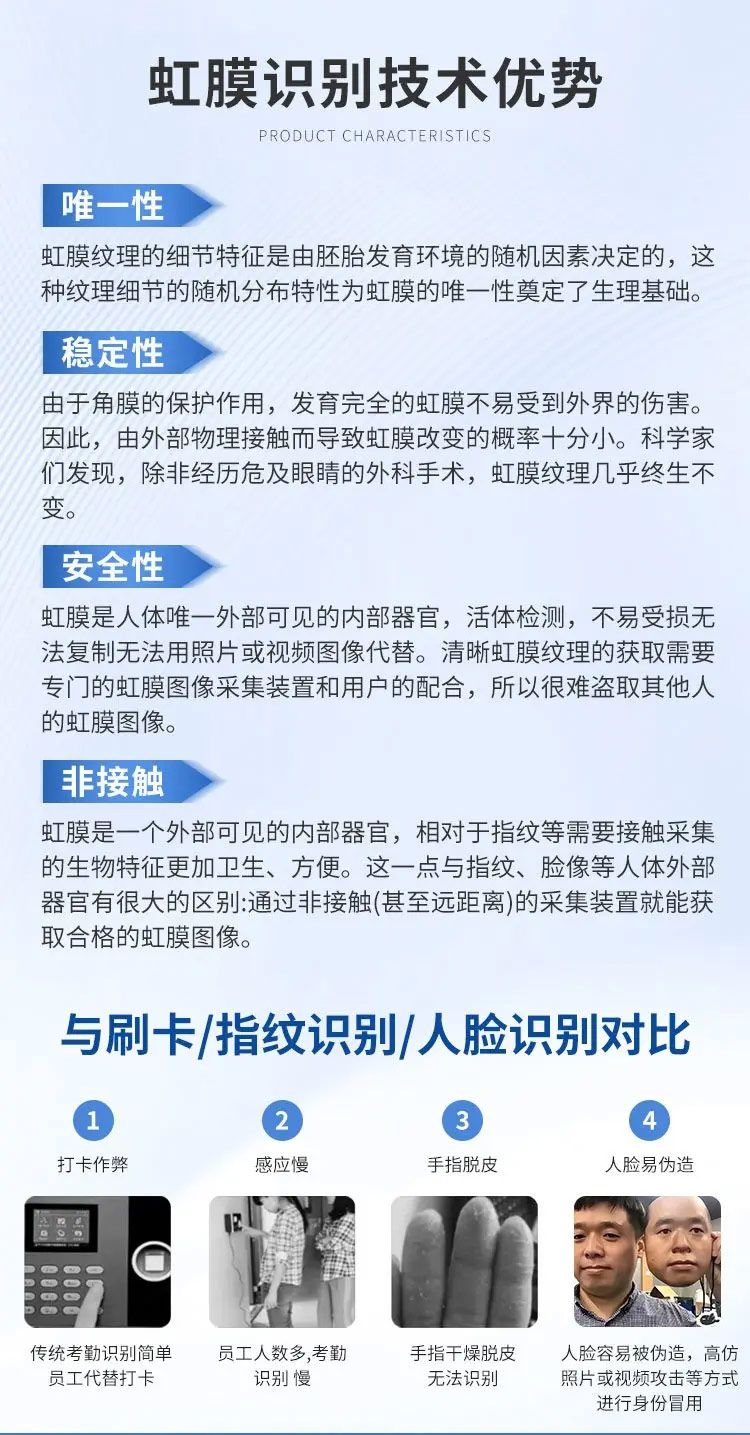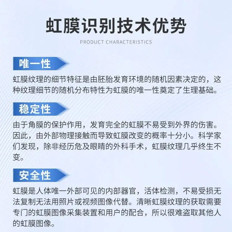 虹膜是人体唯一外部可见的内部器官,活体检测,不易受损无法复制无法用照片或视频图像代替。清晰虹膜纹理的获取需要专门的虹膜图像采集装置和用户的配合,所以很难盗取其他人的虹膜图像。虹膜是一个外部可见的内部器官,相对于指纹等需要接触采集的生物特征更加卫生、方便。这一点与指纹、脸像等人体外部器官有很大的区别:通过非接触(甚至远距离)的采集装置就能获取合格的虹膜图像。