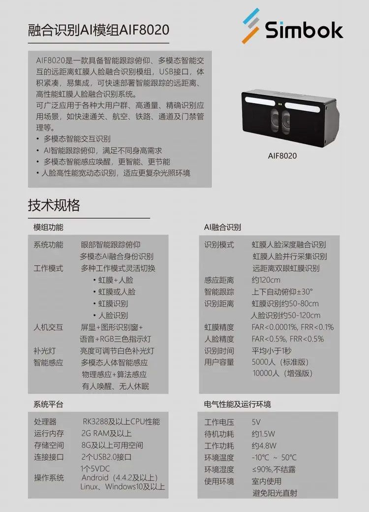 当前位置:九鑫智能机器人网 › 常州新区玮硕电子有限公司 › 动态虹膜人脸追踪识别 高精度身份验证AI模组 芯光虹创 极速物流